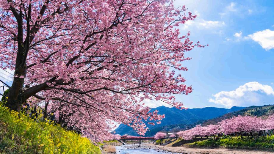 下賀茂温泉を流れる青野川沿い、約4.2kmの両岸にはおよそ800本の河津桜が植えられています。河川敷に咲き誇る菜の花とのコントラストも美しく、あたり一帯が春色に染まる様子は壮観。