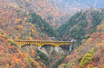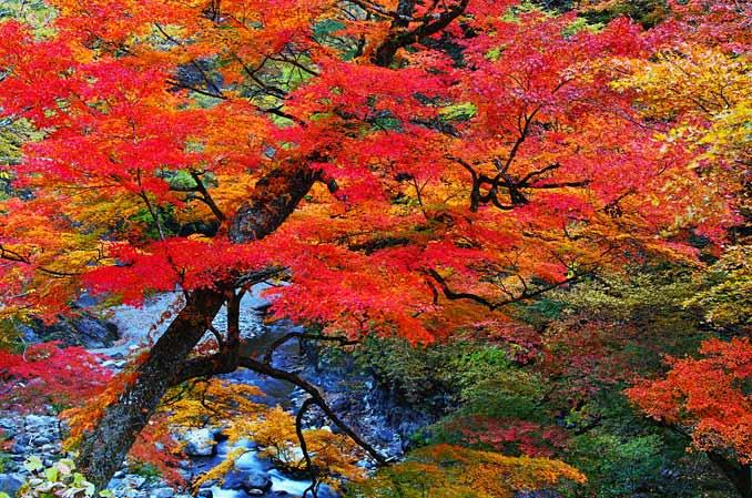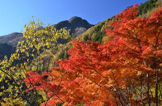 荒川の支流である中津川が形成した約10kmの中津峡は、県の指定名勝であり奥秩父を代表する紅葉スポット。高さ約100mにも及ぶ断崖絶壁と赤や黄色に彩られた原生林が見事な景観を作り出します。中でも、持桶トンネル手前にある持桶女郎もみじ周辺はおすすめの観賞スポットです。