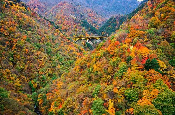 約6kmの規模で広がる「滝川渓谷」は、深いV字地形に茂る木々の紅葉が美しいスポット。国道140号の「彩甲斐街道」を雁坂トンネル方面に向かうと、紅葉で彩られた山の中に浮いているかのような光景が見事な「豆焼橋」や「雁坂大橋」があります。「彩甲斐街道 出会いの丘」から、豆焼橋と周辺の景色を望むことができ、豆焼橋の歩道から、紅葉に囲まれた雁坂大橋の風景を眺めることができます。