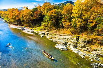 国の名勝・天然記念物に指定されており、関東屈指の景勝地として知られている長瀞。荒川が流れる長瀞渓谷には、地質学的にもめずらしい約600メートルにわたる岩畳や高さ数十メートルのダイナミックな秩父赤壁などの奇岩が並びます。紅葉の時期には川沿いのモミジやクヌギが色づき、美しい景観が広がるエリア。長瀞名物のライン下りは、緩急の流れを楽しみながら紅葉観賞ができるおすすめアクティビティです。