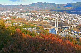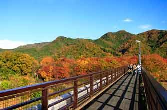 高さ約20mの橋から、360度のパノラマビューを楽しめる絶景スポット。紅葉の時期には、青空と赤や黄色に色づいた木々のコントラストが特に美しく、目を楽しませてくれます。徒歩と自転車のみが渡れる橋なので、車やバイクの走行を気にすることなく写真撮影ができます。