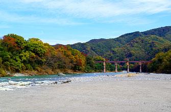 国道140号にある親鼻橋の下は、荒川の河原に気軽に下りられるレジャースポット。長瀞ライン下りの乗り場があり、駐車場や水道・トイレも整備されています。下流側には、秩父鉄道の列車が走る荒川橋梁があり、紅葉の時期には絶好の撮影場所として知られています。