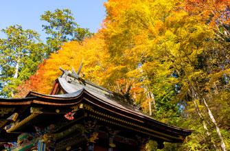 権現造りの社殿には、青竜・白虎・朱雀・玄武や二十四孝(にじゅうしこう)の孝行話を表す細やかな彫刻が施されており、見ごたえ十分。紅葉の時期には、境内のライトアップが行われ幻想的な光景が広がります。
