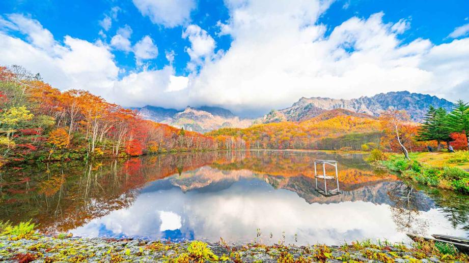 紅葉の見頃は、例年10月中旬~10月下旬頃。コハウチワカエデやシラカバ、カラマツが赤や黄金色に染まり、大正池、田代池の湖面や穂高連峰を彩ります。特に雄大な山々を映す大正池は、まるで絵画のような美しさ。また、山頂が初冠雪すると、雪の白、カラマツの黄金色、針葉樹の緑からなる三段紅葉を眺めることもできます。