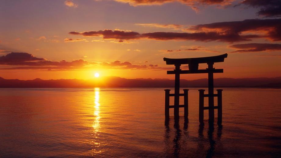 琵琶湖の中に立つ大鳥居で知られる、近江最古の神社「白鬚(しらひげ)神社」。大鳥居と琵琶湖の向こうから太陽が昇る幻想的な風景を見られます。