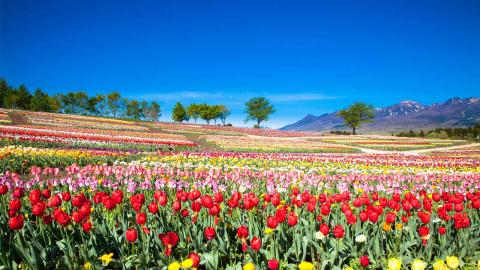 スカーレットフレームの濃赤色やカルビデスホワイトの白色に加え、ピンク色、紫色など多彩な品種の可憐な花々が、美しいグラデーションを形成。まるでパッチワークのように整えられた芝桜畑の間には木道が整備されており、ゆっくりお散歩を楽しめます。