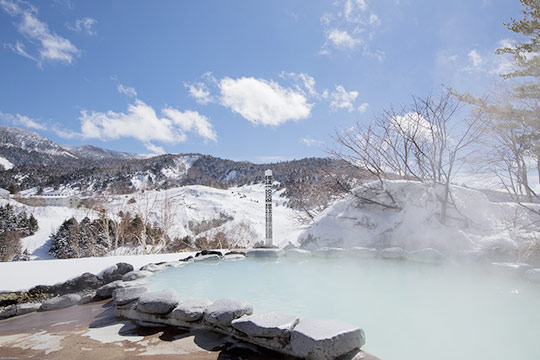 ゲレンデ直結の宿泊施設には日帰り入浴ができる温泉もあるので、思いきり遊んだあとは絶景露天風呂の白濁の湯で疲れをとるのもおすすめです。