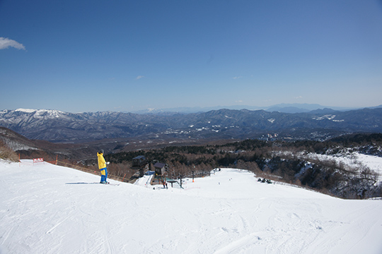 シーズンが長く、晴天率が高いことで知られる「鹿沢(かざわ)スノーエリア」。青空の下、雄大な景色を眺めながらさわやかに滑ることができ、さまざまなウィンタースポーツに対応していて、スノースクートやエアボードなどの滑走も全日OK。