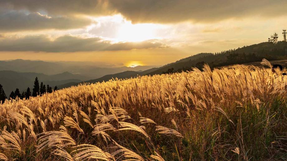大分県の「飯田高原」は、「阿蘇(あそ)くじゅう国立公園」内にある広大な高原。ゆるやかな丘陵が続き、牧歌的な風景に癒される自然豊かな場所です。9月ごろからススキが揺れる風景が見られ、秋の訪れを感じられます。