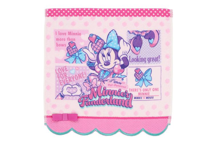 ミラーと合わせてバッグの中に忍ばせておきたいミニタオル。上がピンクのドット、下がスカラップになっているなど、おしゃれなミニーのこだわりを感じます。左下にはさりげなく立体のリボンが!