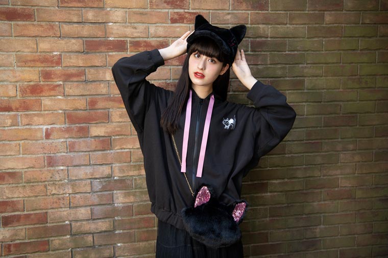 かわいくてクールな黒猫モチーフのデザインシリーズ。ふわもこ素材のキャップは手触り抜群!とんがった耳が特徴的です。フードに猫耳が付いたパーカーは、左胸に「ピノキオのフィガロ」が、背面は蜘蛛の巣アレンジのデザインがプリントされています。チェーンストラップのポシェットは、スパンコールがキラキラと輝くピンクの耳部分がアクセントに。着るだけでライトな仮装気分が味わえて、ガーリーな装いになるラインナップです。