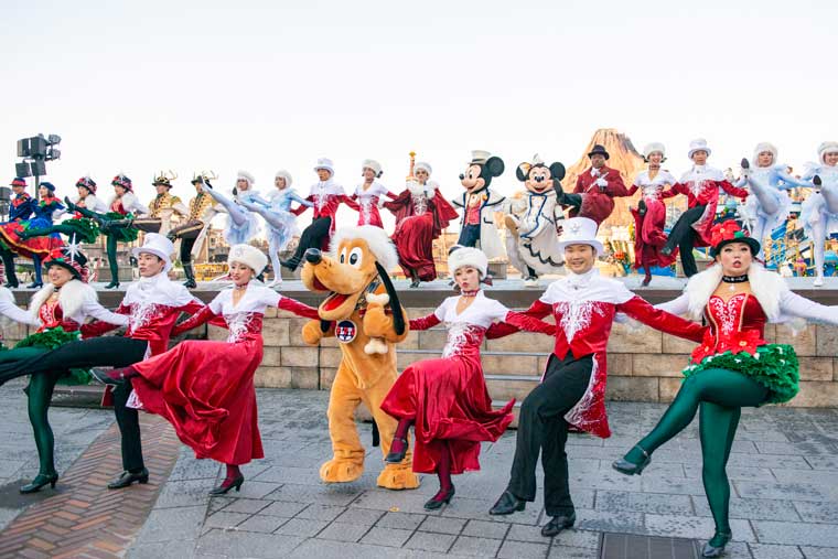 シンガーの歌声にのせて軽快なタップダンスや美しいラインダンスなどが繰り広げられ、東京ディズニーシーならではの心華やぐクリスマスのひとときが楽しめます。