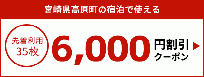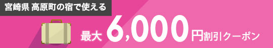 - ・クーポン名:宮崎県高原町の宿泊で使える6,000円割引クーポン