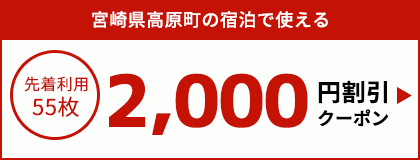 ・対象施設:宮崎県高原町の宿泊施設(※一部ご利用頂けない施設がございます) - ・クーポン名:宮崎県高原町の宿泊で使える2,000円割引クーポン