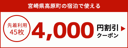 ・対象施設:宮崎県高原町の宿泊施設(※一部ご利用頂けない施設がございます) - ・クーポン名:宮崎県高原町の宿泊で使える4,000円割引クーポン