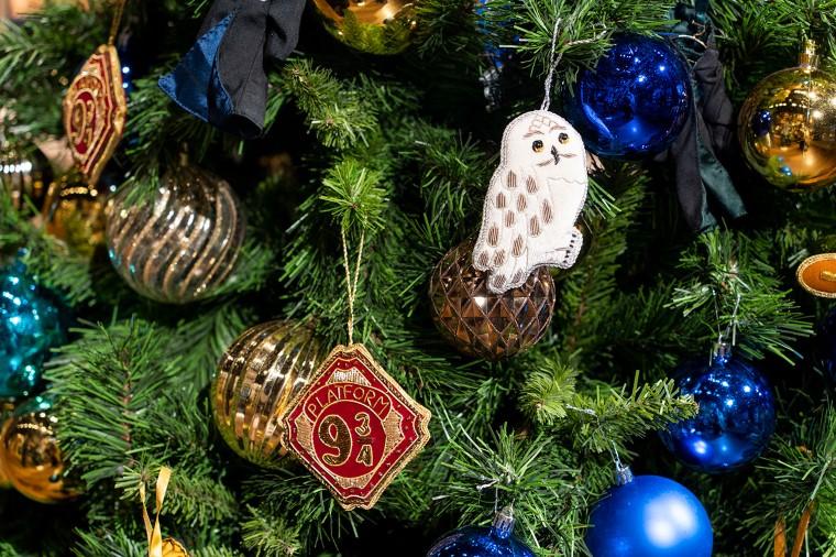 伝統的なファブリックスタイルのオーナメントもあり、「9と3/4番線 オーナメント」(2,600円)は深いバーガンディベルベット×ゴールドの高級感あふれるデザイン。「ヘドウィグ オーナメント」(2,400円)と一緒に飾ると、緑のクリスマスツリーにも映えますね。