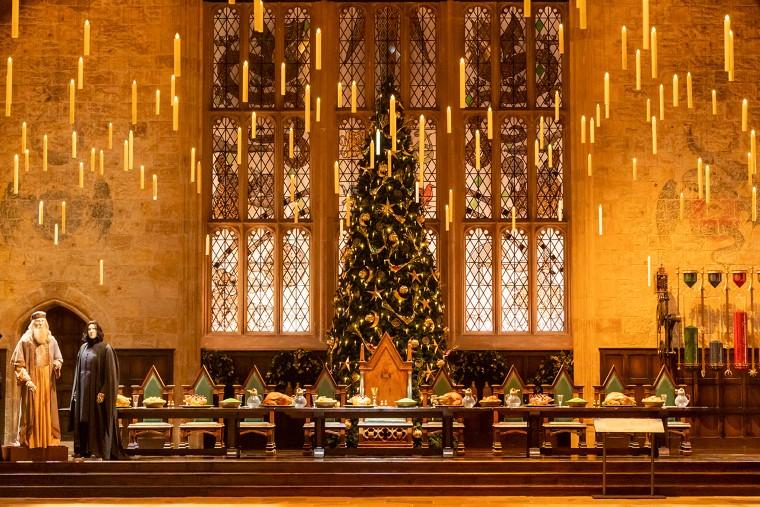 ツリー手前のテーブルには、イギリスの伝統的なクリスマスのごちそうがたくさん。『ハリー・ポッターと賢者の石』では本物の料理を用意して撮影していましたが、撮影が長期化するにつれておいしそうな匂いが悪化してしまったため、樹脂製の食品模型に切り替えたそうです。本物と見間違えるほどクオリティの高いメニューの数々は、見ているだけでお腹が空いてきそう……!