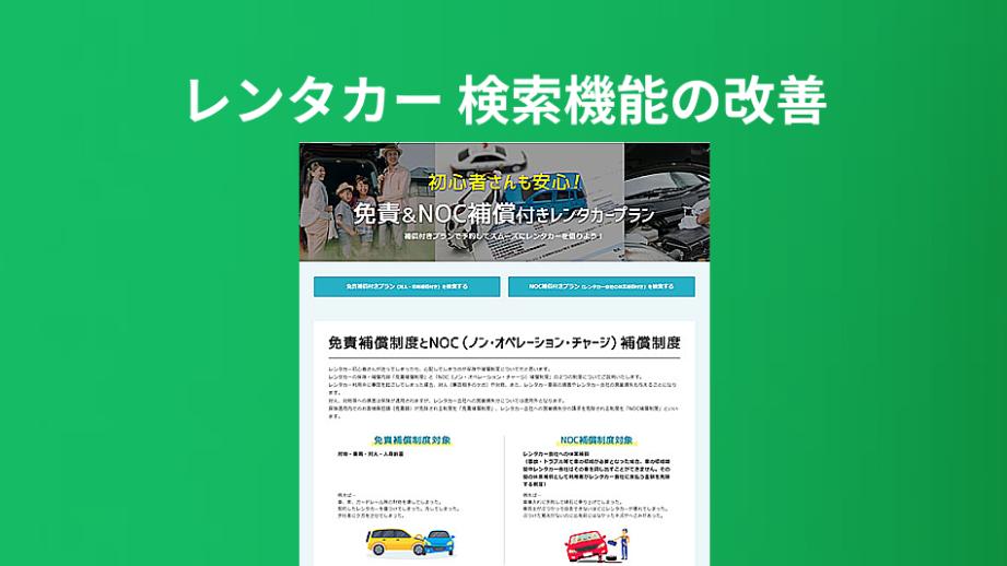 「任意加入の免責補償、NOC補償が分からない」という点をふまえ、制度について説明ページを作成し、分かりやすくしました。また「補償付きプランで予約したい、検索したい」というお声を受け、「免責補償プラン」か「NOC補償付きプラン」の希望、利用日時、エリアなどを選択していただくと、該当の補償が付いているプランだけを検索、予約ができるようになりました。万が一の場合も安心の補償付きプランをぜひご検討ください!