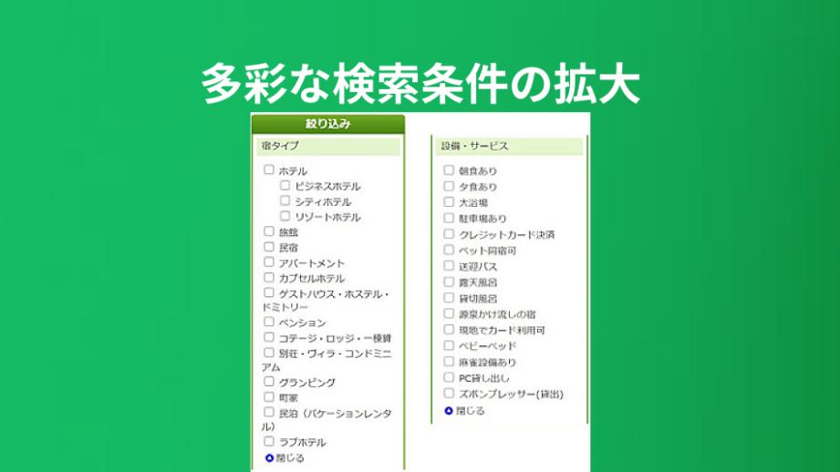 宿泊施設を探す際、より自分の求める条件に合わせて検索がしたい