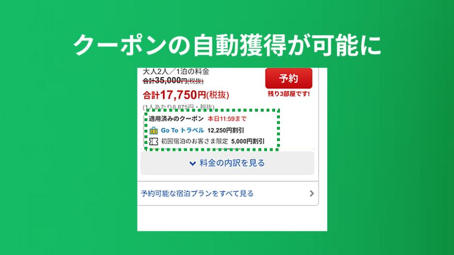 国内宿泊予約をご利用の際、検索結果に表示されている条件に合致するクーポンについて、お客さまによる獲得ステップを不要とし自動的に獲得できるようになりました。