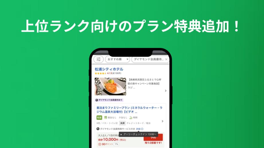 会員ランクが高い人向けの特典があるとよい国内宿泊でダイヤモンド・プラチナ会員限定のプラン特典を開始しました