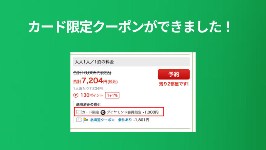 各エリアの検索ページにいくと、宿泊代金の下にカード限定クーポンが表示されているか確認し、予約ステップに進んでいただければと思います。