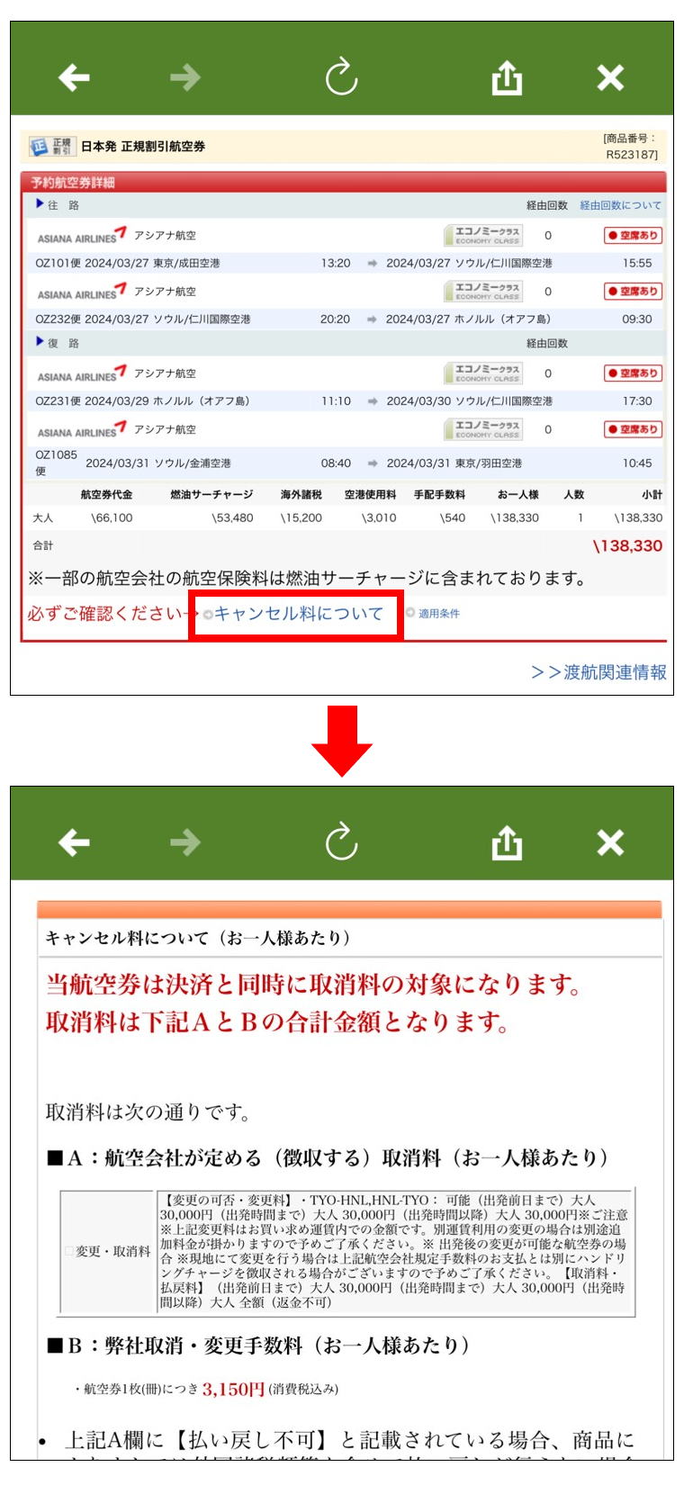 公開日: 2023/12/27 お客さまの声 お客さまの声 海外航空券のキャンセルポリシーが見つからない アプリ利用時の予約画面に海外航空券のキャンセルポリシーを見やすくしました 海外航空券の予約の際にキャンセルポリシーが見つからないというお声をいただいておりました。 そこでアプリ利用時の予約画面に海外航空券のキャンセルポリシーを見やすくしました。 さっそく海外航空券を検索してみる!(TOPページへ遷移します) サービス改善に対するご要望はこちら Article survey お客様のご意見をお聞かせください このページは気に入っていただけましたか? 不満 やや不満 ふつう やや満足 満足