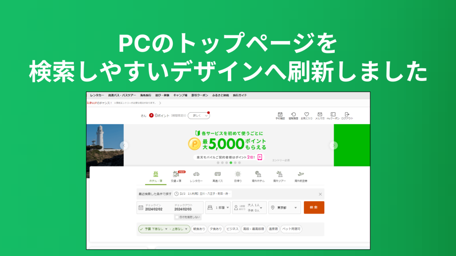 PCのトップページのデザインがわかりにくい、検索がしづらい多様化した旅行ニーズに対応し、検索がしやすいデザインへ刷新しました