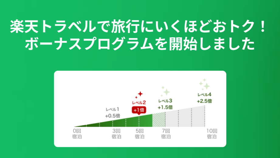 公開日: 2024/03/22 お客さまの声 お客さまの声 利用回数に見合った特典やポイントが欲しい 楽天トラベルで旅行に行くほどお得になるボーナスプログラムを開始しました 皆様の声にお応えして、国内宿泊回数に応じて対象施設のポイント倍率がアップするボーナスプログラムを開始いたしました! ぜひご自身の現在のレベルを確認してみてください。 ボーナスプログラムの詳細はこちら サービス改善に対するご要望はこちら Article survey お客様のご意見をお聞かせください このページは気に入っていただけましたか? 不満 やや不満 ふつう やや満足 満足
