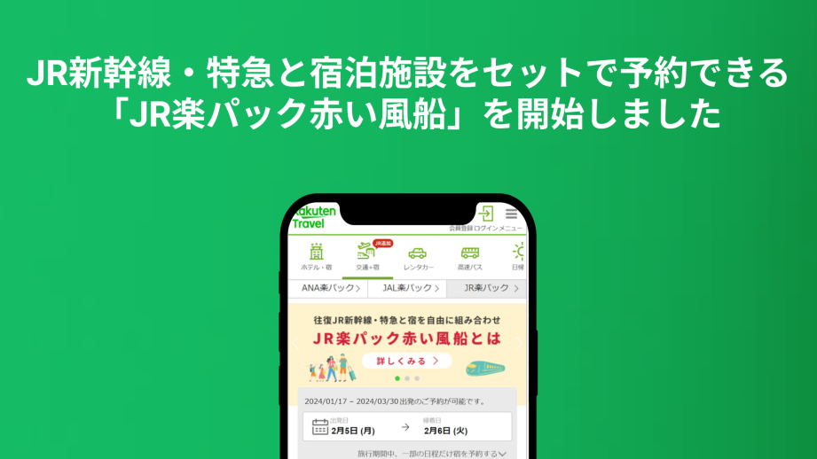 JRと宿がセットになったパッケージツアーも販売して欲しいJR新幹線・特急と宿泊施設をセットで予約できる「JR楽パック赤い風船」を開始しました
