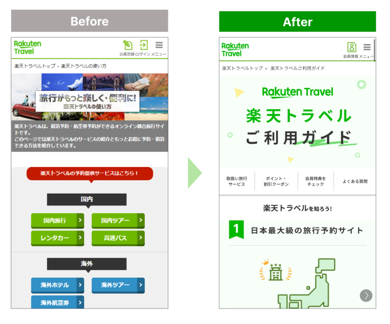 また、スマートフォンでも見やすいようにページ表示の最適化を行い、トップページから直接、楽天トラベルご利用ガイドを見られるようになりました。