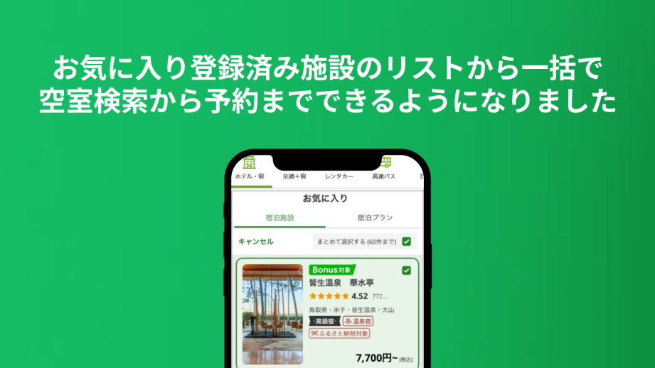 お気に入り登録したホテルだけを一括で日付指定して空室確認から予約までできるようにしてほしいお気に入り登録済み施設のリストから一括で空室検索から予約までできるようになりました