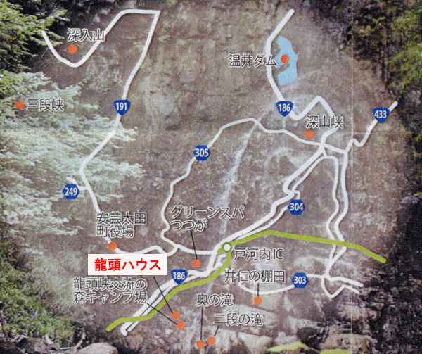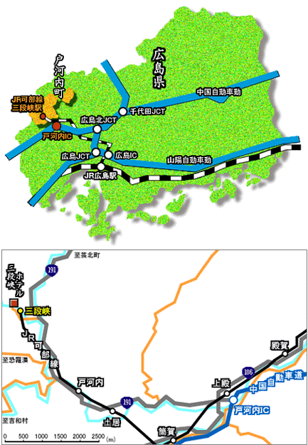 [アクセス]バス終点 三段峡バス停より100m/中国自動車道戸河内ICより191号線を北上し落合橋(赤い橋)を左折800メートル![]()
