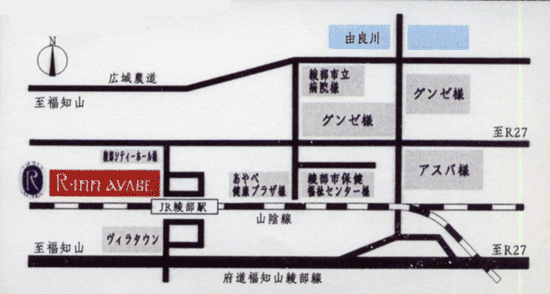 [アクセス]JR綾部駅北口徒歩1分:舞鶴若狭道(吉川?無料区間実施中) 綾部I.C約5分 京都市内からなら福知山・舞鶴より近く便利♪![]()