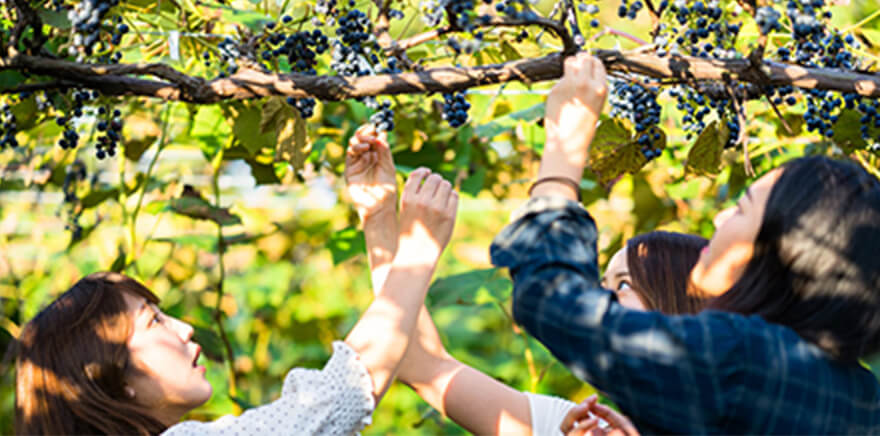ぶどう狩りは、『ベリーA』『ニューピオーネ』『マスカット』の3種類から選べ、時間無制限、食べ放題が楽しめます。
